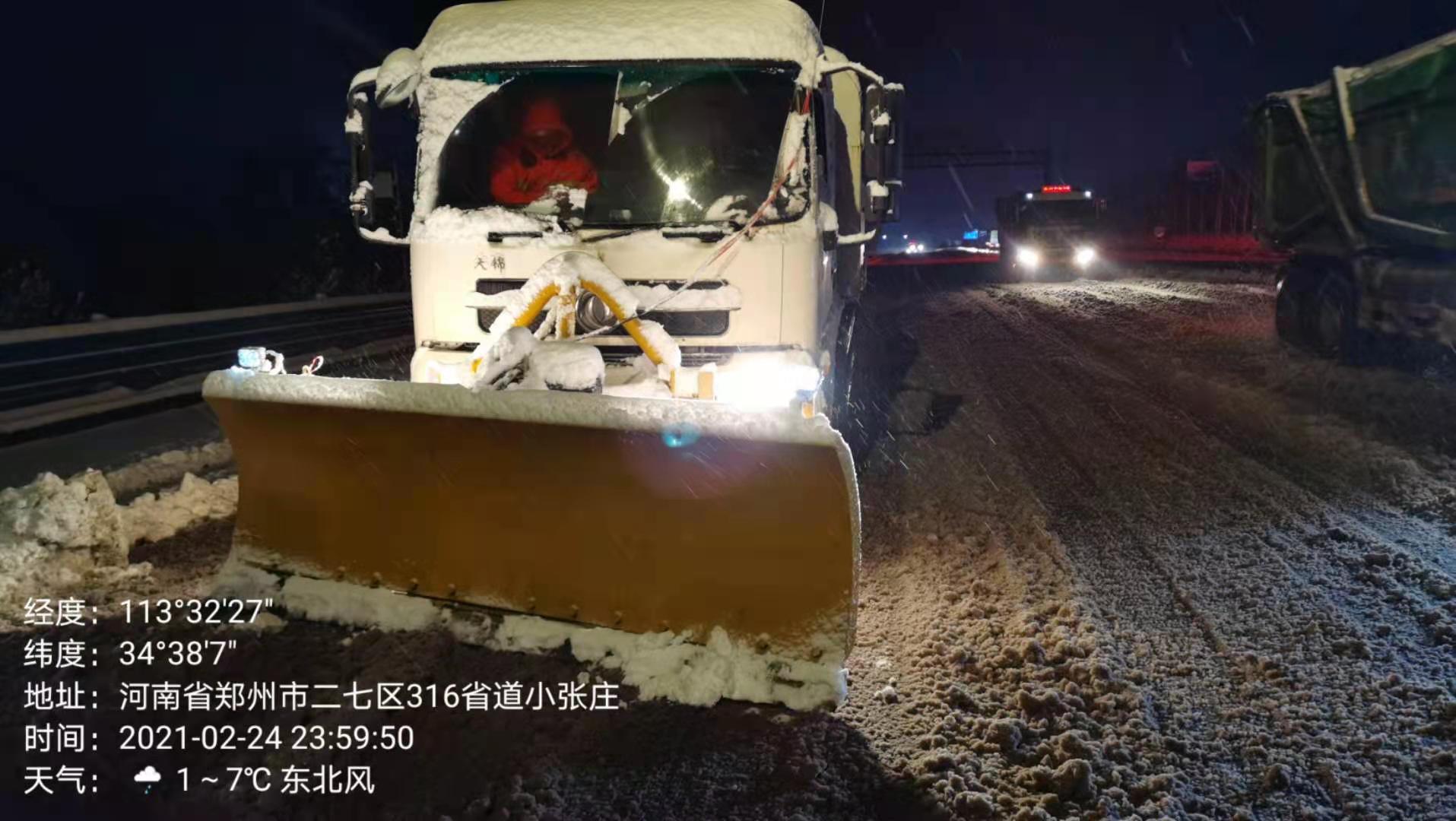 2021年2月24日晚,鄭州市突然大雪紛飛,氣溫驟降。寒風如刀,雷電交加,惡劣的天氣卻阻止不了公路人除冰保暢的信念,冰天雪地里,路通以雪為令,緊急啟動《公路除雪應急預案》,按照既定工作方針,全力開展公路除雪防滑工作。經(jīng)過一夜奮戰(zhàn),2月25日清晨國省干線公路和市域快速通道所有公路均可正常通行,全力保障了公路安全暢通無事故。